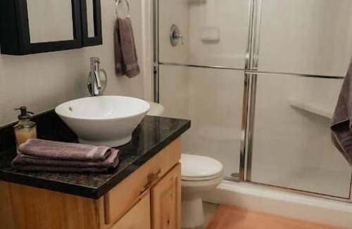 Our AirBnB has a south walkway with handrail that descends 11 stairs to the backyard and leads to the private, combination locked entrance. As a guest you will have access to the basement living quarters, the back yard/hot tub area, the community park, and hiking/biking trails.