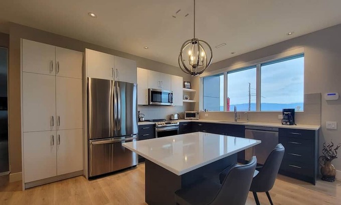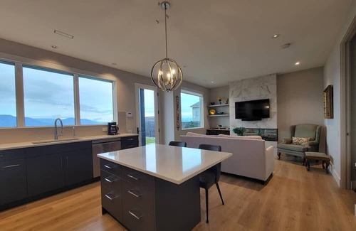 Kick back and relax in this calm, stylish space with 180* beautiful lake views. Fully fitted kitchen, spacious ensuite and laundry room. Soak in the hot tub while enjoying the view, or enjoy a dip in the swimming pool (May - September). Close to hiking/biking trails, 10 minutes drive to the beach, 15 minutes drive to downtown Kelowna.