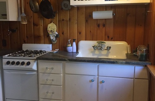 ~The Cozy kitchen is complete with a compact fridge, gas stove, microwave, coffee maker, dishes, glassware, stemware, silverware.