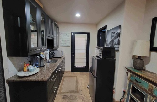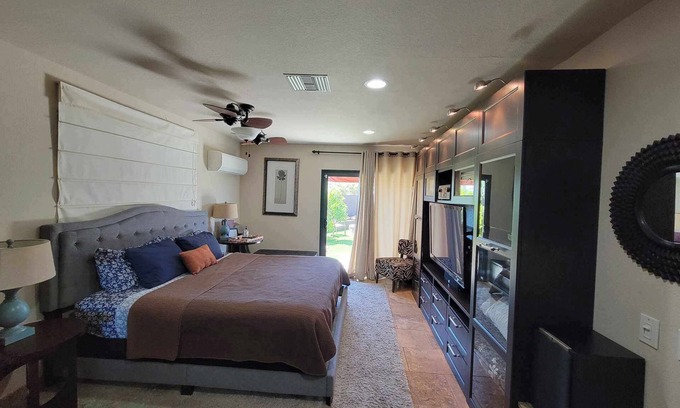 Kickback and relax in this calm, stylish private casita with kitchenette and bathroom. Enjoy the beautiful sunset on the patio with seating area. Centrally located on a beautiful golf course and close to many activities, food and outdoor adventures.