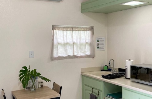 Inside the studio, you'll find all the comforts of home, including a well-equipped kitchenette with a mini fridge/freezer combo, microwave, Keurig coffee maker, and all the dishware and silverware you need. The living space is thoughtfully designed with a queen-sized bed, a cozy loveseat, a table for two, and an adjustable flat-screen TV that you can enjoy from the comfort of your bed or the loveseat.