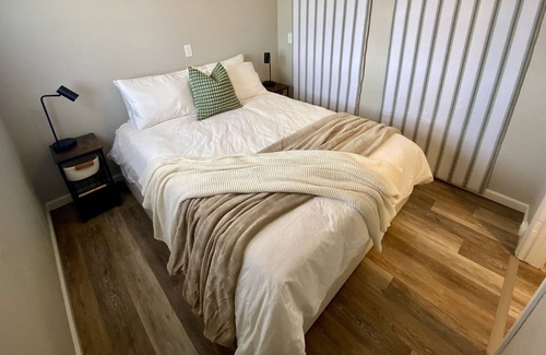 In the bedroom, there is a comfy queen sized bed with drawers underneath for your clothes and a white noise machine.
