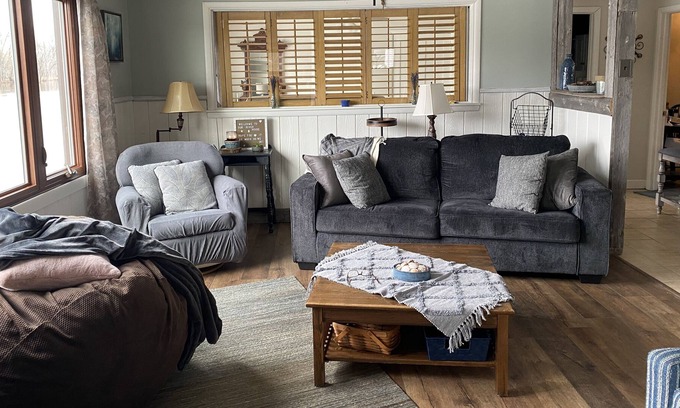 Spacious cozy happy comfy home w panoramic view right on the rock river… open floor plan 2BR with queen beds, optional pull out beds full and queen, full kitchen with dishwasher, airfryer, & coffee bar.