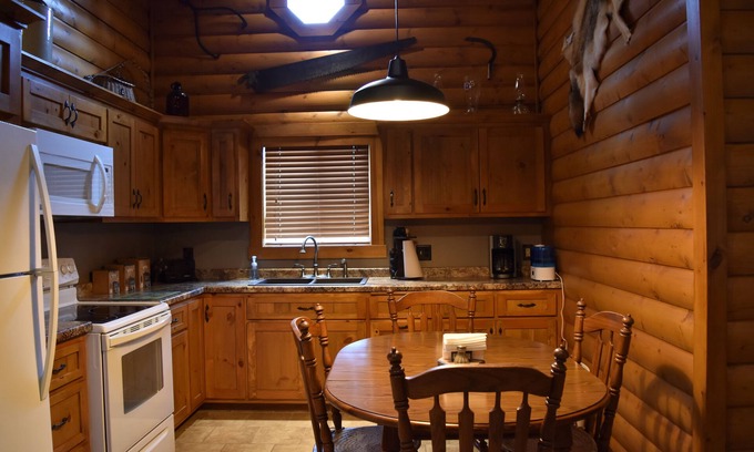 This quaint unsuspecting cabin features a split log interior, sleeping loft and finished garage with bar, pool table and dart board. You can cozy up in the winter months next to the wood stove and enjoy in-floor heating throughout, or relax in the summer months in AC.