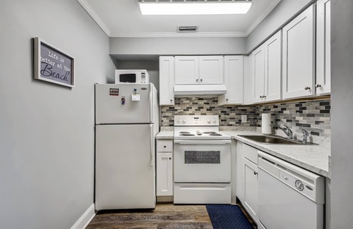 You will also find a full kitchen which comes complete with white granite counters with cabinets to match. Stocked with all the basic cookware one might need to create a feast fit for royalty, you are sure to enjoy the chance to make your home even more cozy by filling it with the delightful scents of your home-cooked meal. Holiday Hideaway also features a clothes washer, dishwasher, and dryer, which is always a perk, and any who have paid their dues in youth while trudging along to the laundromat are sure to love this small extra something. As well you'll find a community pool which is perfect for relaxing in and potentially even make some knew friends as you chat with the other tourists enjoying the waters.