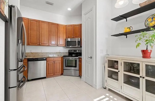 Fully Furnished (Turnkey) beautiful townhome with 2 car garage and 20ft Ceilings located in a gated community close to everything including shopping, restaurants, medical facilities and 5 minutes to the beach. This home has 2 large bedrooms / 2.5 Baths / Large Loft for study or extra sleep area upstairs overlooking the Great Room. The Kitchen boasts Stainless Appliances and Granite throughout. The back patio is screened that opens up to a large brick entertainment courtyard area where you can enjoy the cool breezes during the fall and winter months. During your leisure time, enjoy the fully equipped fitness room, tennis courts, or the lovely resort style community pool and grand club house. "In accordance with HOA rules and guidelines, stays must be at least 89 days Minimum, with a simple background check required.”