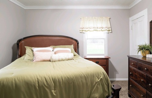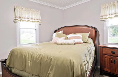 Now the house boasts a productive kitchen, gas range with oven and broiling option great for steaks. Full size fridge so you can shop once. The microwave is for those who like the less time consuming way to prepare food. The kitchen is stocked with a crock pot, pots and pans, waffle iron, blender, mixer, pie plates, cookie sheets, bread pan, mixing bowl, plates, bowls, glasses, coffee mugs, & serving utensils. You also have access to use the washer and dryer for laundry (bring your detergent). There are 4 bedrooms, the Master room has a local Amish made queen bed, with nightstand, and dresser. It also has a closet. The large bedroom upstairs has another queen bed, with space on the floor if you brought a sleeping bag for another person (or you may take the pack and play up there), it also has a closet and dresser. Another bedroom has King size bed. And the 4th bedroom has a full size bed, you must go through the King bed, bedroom to access this room. The bathroom has a bathtub/shower, and hairdryer.