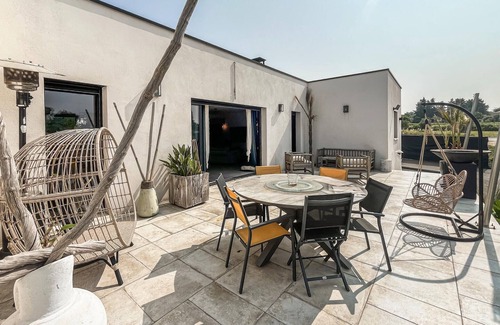 This modern holiday home welcomes you in an ideal location between Nîmes and the Cévennes to explore the many treasures of Provence. Be inspired by the special flair of this lovingly designed family home, which offers you plenty of space for harmonious hours with your loved ones. Plan your activities over convivial meals, relax with a fun games evening or soak up the atmosphere in the evening with a glass of wine.