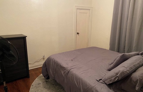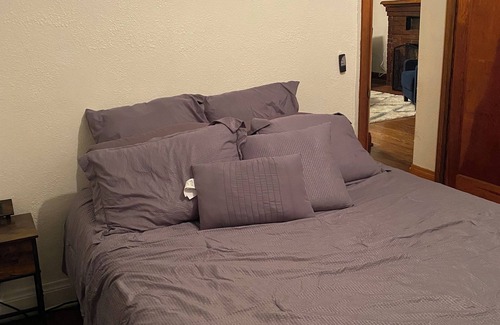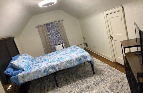 There is a front porch for setting with the view of a large shared front yard; which has trees for bird watching. This property’s yard is shared between the house and garage apartment. Living room, dinning room, fully functional small kitchen. Main floor bedroom features a queen bed with closet and dresser. Upstairs has a bedroom with 1 twin daybed, 1 twin xl, floor mattress, and the second room with a queen bed. The living room has a pull out couch which is a full; provided in closet are the sheets and pillows. Living room has a 55” Roku tv and upstairs has a 32”