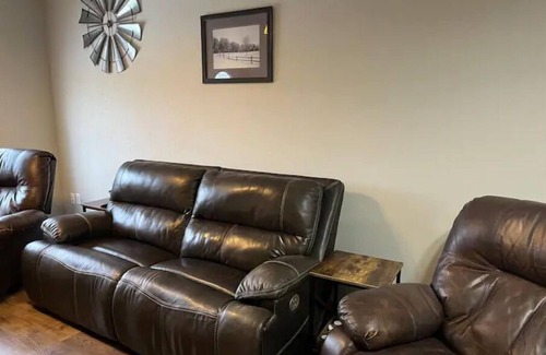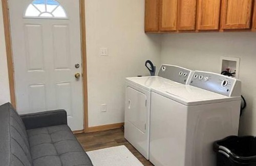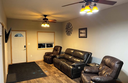 Located on a large lot in Penn, ND, our home is the perfect getaway. A comfortable living area extends into a large kitchen, stocked with all the kitchen utensils, appliances (including a coffee pot) and spices you may need. Our master bedroom includes a king sized bed, second bedroom includes two twin sized beds and the third bedroom has one twin sized bed (the third room does not have a door). All rooms include power strips with USB ports. There is a fold down sofa in the laundry room that can be used as an extra bed.