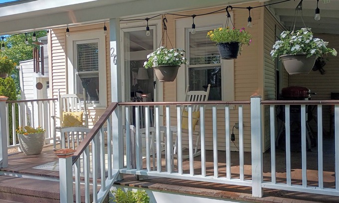 Our charming 2 bedroom cottage with it's wrap around front porch has a warmth that is bright, comfortable and inviting. The wood and tile floors offer a clean and open feel. The bedrooms also with wood floors are bright and comfortable. One of the bedrooms has a window seat with views of the river, it is a great room to take in the natural light and read or just sit and relax.