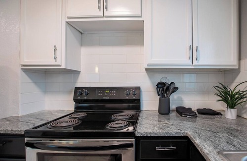Relax in the inviting living room with plush seating, a smart TV, and high-speed WiFi. The fully equipped kitchen has all the essentials for home-cooked meals. Outside, enjoy the front porch and the dedicated parking space for stress-free arrivals.