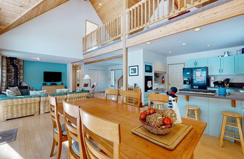 Located near a variety of activities, including Nordic and downhill skiing, snowboarding, hiking, and wildlife viewing, this house is a haven for outdoor enthusiasts. After a day of adventure, return to the comfort of your home away from home and relax by the fireplace in the living room. The themed decor of the house adds a touch of personality, making your stay truly memorable.