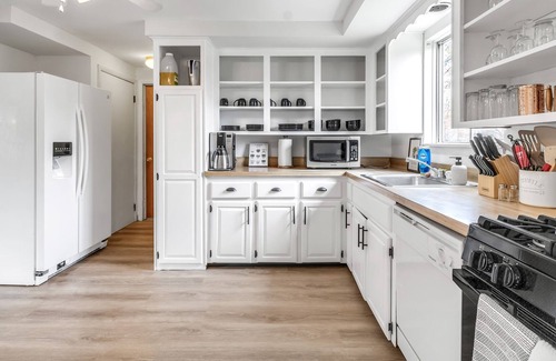 Get ready to unleash your inner chef in the fully-equipped kitchen! Whip up delicious meals with ease using the brand new gas stove, large refrigerator, and convenient dishwasher. The crisp white cupboards and ample storage space will make you feel right at home. The kitchen seamlessly flows into the light and airy dining room, creating the perfect space to enjoy your culinary creations. Relax in the cozy seating for four and savor every bite. With the dining room just steps away from the kitchen, mealtime is a breeze.