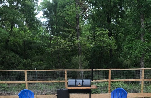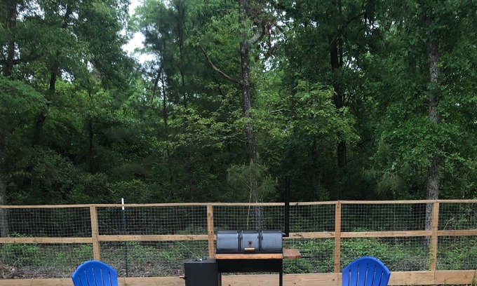 2 story, 2 bedrooms upstairs, with 2 full bathrooms upstairs and 1/2 bath downstairs. Ceramic flor tile throughout first floor and in both restrooms upstairs. Kitchen with dishwasher and microwave and full size refrigerator. 3 smart TVs in the house along with wireless internet. Full size sleeper sofa downstairs. Master has a queen bed while the 2nd room has bunk beds..twin on top and full on bottom. Large covered porch in back yard with ceiling fans, charcoal smoker pit and large picnic table. Fire pit with plenty of seating to enjoy nice cool nights, privacy fence around backyard with view of wooded area.