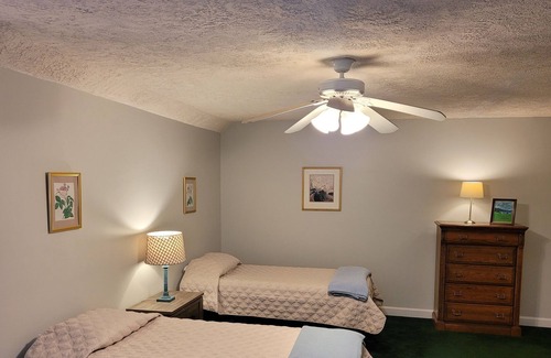 This apartment attached to our home has a private entrance leading to an open dining and living room area. The futon in the living room converts to a full-size bed, suitable for one adult or two children. The large kitchen is thoroughly equipped with a full size refrigerator, electric stove, dishwasher and microwave. Complete sets of dishes, glasses, utensils and cookware are provided. A half bath completes the first level.