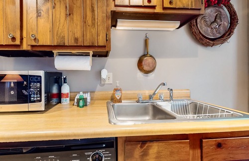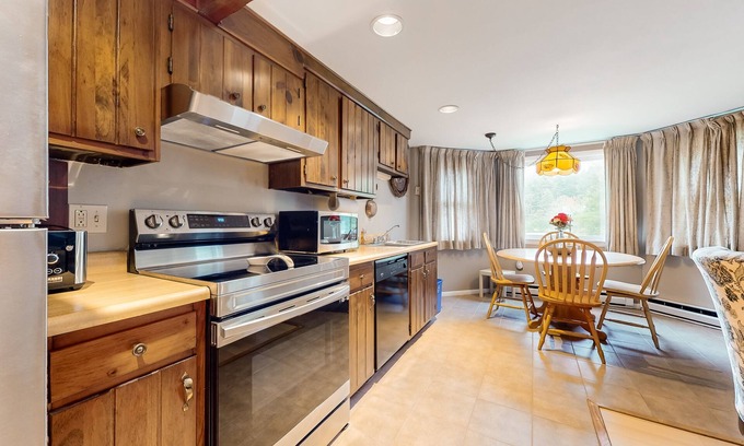 The condo is warm and welcoming, full of plush furnishings and large windows that frame the surrounding treetops. After a day of adventure, fix a hearty homemade meal using stainless steel kitchen appliances, sit down together at the windowside dining table, and find a favorite movie to watch on TV afterwards.