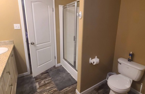 The master bedroom has a queen bed and a large private bathroom with his-and-her sinks, a shower, and a separate large garden tub. The additional 2 bedrooms have a full bed, and bunk beds, respectively. Bedding and pillows are provided. An additional full bathroom has a combination tub / shower. Toilet paper and hand soap is provided.