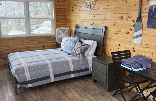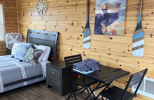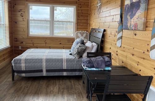 This dry cabin offers a Queen size bed, mini fridge, and a microwave. The small porch is a great hang out spot to relax and to enjoy the view of the lake.