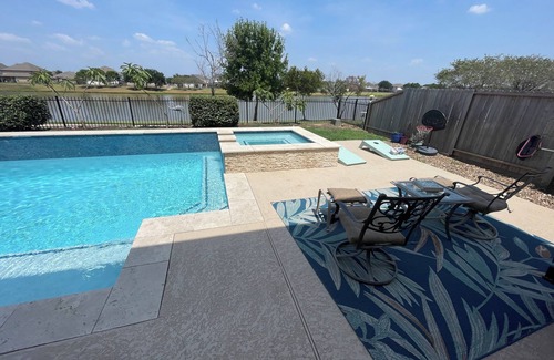 Relax with the whole family at this peaceful place to stay. With the beautiful lake views & a cool dip in the pool you are sure to enjoy down time with family and friends or work remote in this spacious retreat. Neighborhood equipped with a walking trail behind the house and a park at the end of the lake (fishing aloud). Minutes to downtown Rosenberg, Brazos Town Center & walking distance to the Fort Bend County Fairgrounds. Sugar Land is a quick 15 minutes on Hwy 59 South & Houston 15min more (30 minutes total) Pets are allowed for a fee and pool and hot tub can be heated for a fee as well as pool fearures turned on for a fee. Lights are included with nightly rate.