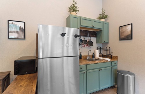 Step inside and you'll find a cozy yet spacious living area featuring a comfortable queen sleeper sofa and a mounted smart TV—perfect for relaxing after a day of outdoor adventures. The studio includes a convenient kitchenette, equipped with a full-size refrigerator, microwave, coffee maker, toaster, and all the basic essentials for preparing light meals and snacks. Enjoy your meals at the dining table with seating for three, or savor your morning coffee while soaking in the views of Keystone Lake just outside your window.