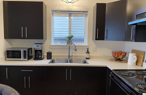 The suite is brand new and immaculately clean, with a spacious living area that features comfortable seating, a flat-screen TV & cable, and plenty of natural light. The bedroom is tastefully decorated, with a comfortable king-sized bed. The kitchen is fully equipped, with a refrigerator, stove, and microwave, making it easy for guests to prepare their own meals.