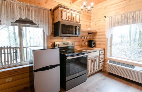 From a perched view overlooking a pond, the Fox's Den Lodge Suite is the perfect vantage point for a scenic, mostly wooded quiet stay. With over 1,100 square feet, the unit is located only 1/2 mile to Berlin. Offering luxury comfort, the cabin features a stone fireplace, a Jacuzzi tub for 2, a full kitchen, a 55" LED TV, and a spacious relaxing living room.