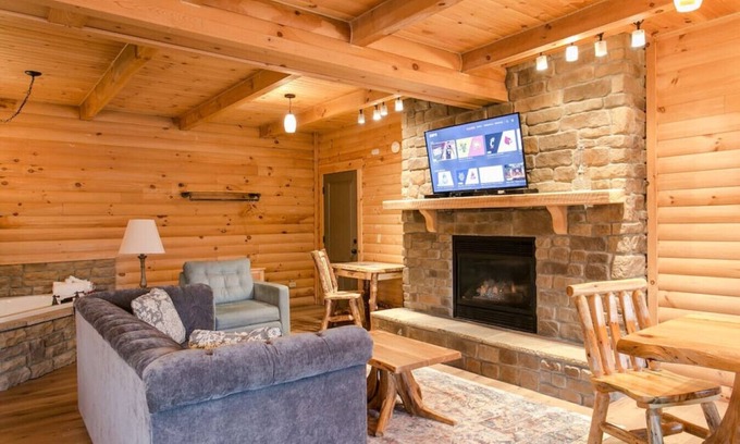 LIVING AREA: Boasts a massive jetted tub for 2, and a stone hearth that encases a large gas fireplace. A comfortable sofa and overstuffed soft chair are the perfect places to read by the fire or watch the 50 inch Roku Smart TV. Split log planking and roughly finished beams surround you as you enjoy your breakfast at the sturdy wooden four-person table with chairs. This room has its own heating and air conditioning unit to maximize your comfort.