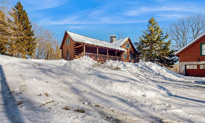 Escape to this remote log cabin getaway in Barnard, VT, where tranquility and nature await you. This 3-bedroom, 2-bathroom house offers a cozy retreat surrounded by the beauty of the Vermont countryside. The property features a balcony, perfect for enjoying your morning coffee or stargazing at night, as well as a detached garage with a studio that includes a queen bed, queen futon, kitchenette, and full bathroom for added convenience.