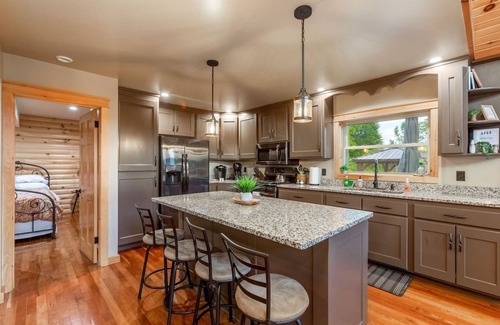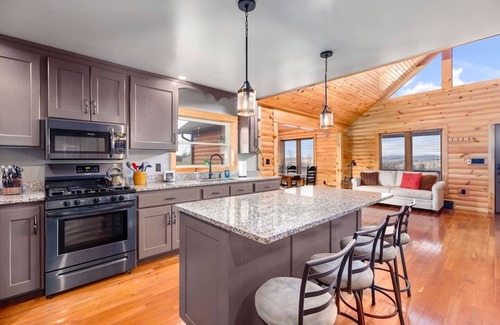 If you're looking for a log cabin with a stellar view, you'll love this vacation spot! This home features an open concept floor plan with tons of natural light, vaulted ceilings, gorgeous hardwood cherry floors, and a great front porch. This space offers 3 Queen beds and one sofa bed to accommodate 8 and is the perfect spot for your next scenic getaway. There are so many ways to catch up on that much needed R&R during your stay. You can relax inside by the crackling fireplace, enjoy the mountainous views from the porch, sit around the outdoor fire pit with Adirondack chairs, or explore nature to clear your mind.