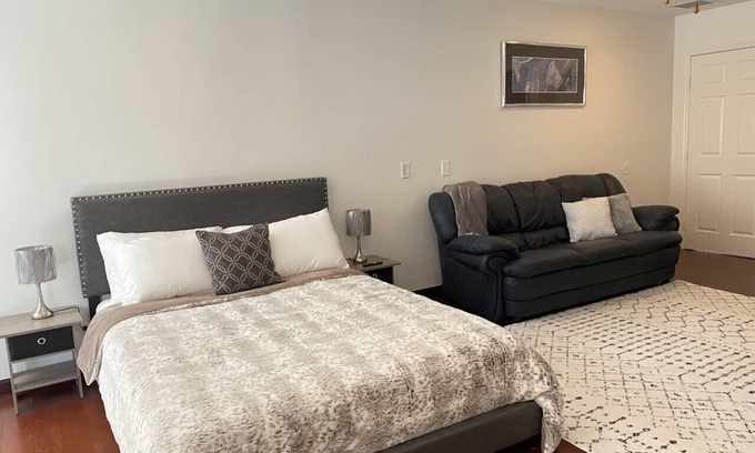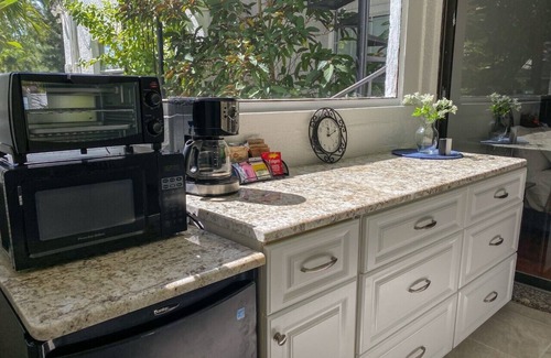 Our Cozy suite has granite counter tops, custom cabinetry, workspace, spacious custom bathroom with jacuzzi bath, shower, and double sink vanity. Enjoy the beautiful garden views from the kitchenette fully equipped with a drip coffee maker, mini fridge, microwave, and toaster oven. Enjoy a morning cup of coffee or breakfast in our lush garden with outdoor seating area by the koi pond or enjoy a morning walk around our scenic neighborhood. The neighborhood is shaped like a horseshoe, with it being almost exactly 1/2 a mile from Mark Lane cul-de-sac to Scott Lane cul-de-sac, perfect for walking a few miles.