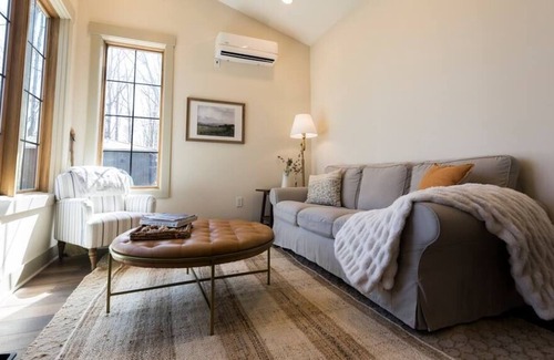 Be transported 1000s of miles away to the English countryside inside this 450 sq ft cottage. It contains a bedroom with a king bed and room darkening blinds, full bathroom with shower, and an open concept living room, dining room and fully stocked kitchen. Large windows in the living room and bedroom look out onto a private deck, hot tub, fire pit, small pond, and of course, the tranquil woods of Wilder.