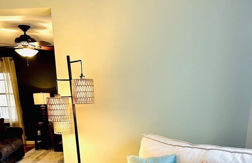Bedroom #2: A cozy room that evokes a calming sense of nature with its soft green walls; equipped with a queen-sized bed and blackout curtains.