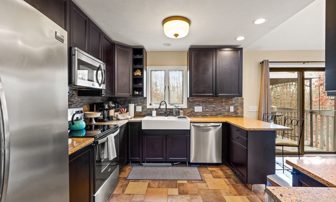 CULINARY CORNER: Fully equipped kitchen, stainless steel appliances, brand new countertops, wine cooler, toaster oven, Keurig/drip duo coffee maker, tea kettle, Crock-pot, full knife set, spices, cooking basics, dishware & flatware