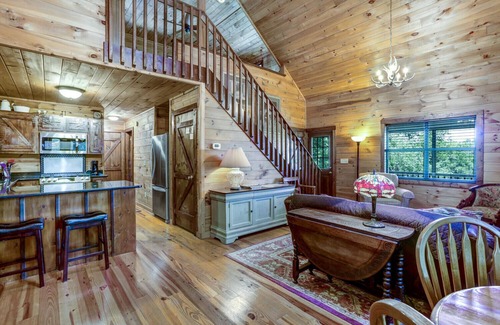 The 2-bedroom (2 beds), 2 bathroom chalet is easy to access. The staircase to the loft bedroom is carpeted for safety. Balcony & front porch have standard-height wood picket railings with outdoor furniture. The kitchen has stainless appliances and a propane gas stove. The living area has a propane gas log fireplace with a push-button on/off and an auto shut-off wall-mounted remote.