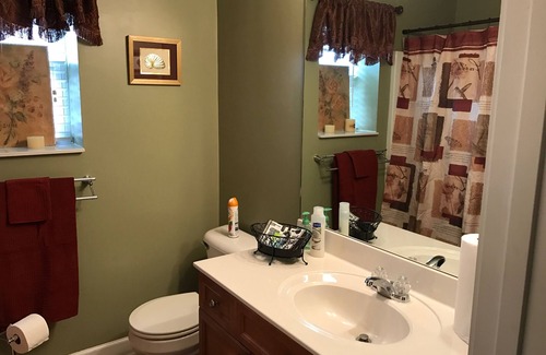 Full, warm earth tone bath amenities includes: fresh linens, bath towels, hand towels, hair dryer and abundant storage.
