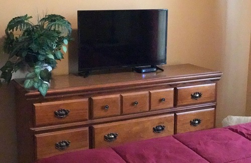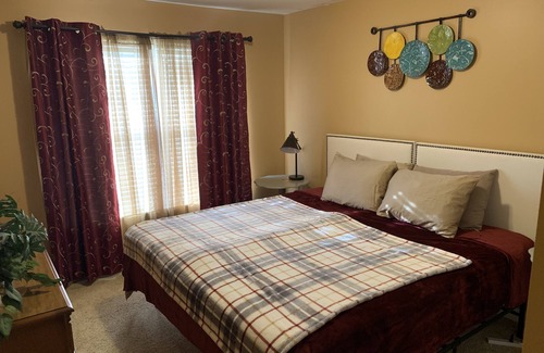 Freshly painted private bedroom with custom window treatments, walk-in closet; full / queen size bed with new linens, fluffy pillows, warm comforters, iron & ironing board, 32 inch LED screen TV with direct TV cable.