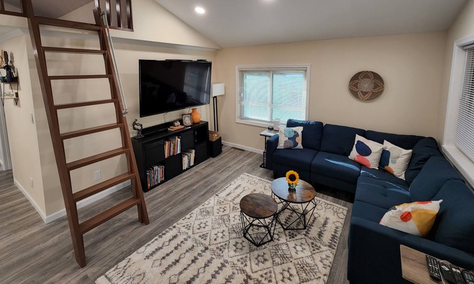 Conveniently located right off 495 and short drive from most activities. Completely renovated, with fully equipped kitchen, tall ceilings in the living room, a comfortable section sofa to relax and watch TV or read a book. Every kids' favorite is definitely climbing the ladder to the loft space a cozy place to read or play board games.