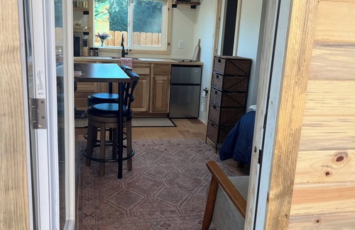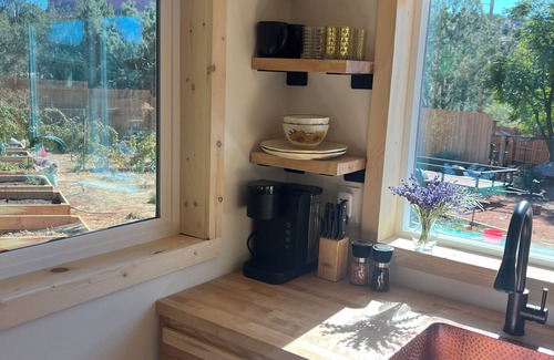 This newly built, off-grid, tiny home is located on our organic hobby farm near the beautiful Oak Creek and epic hiking trails! Enjoy the view of Cathedral Rock from inside or outside the cabin. There are many areas outside to sit and enjoy the property.
