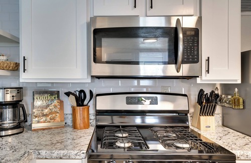 KITCHEN: Fridge, stove/oven, microwave, blender, coffee maker, toaster, dishware & flatware, cookbooks, 2-person high-top