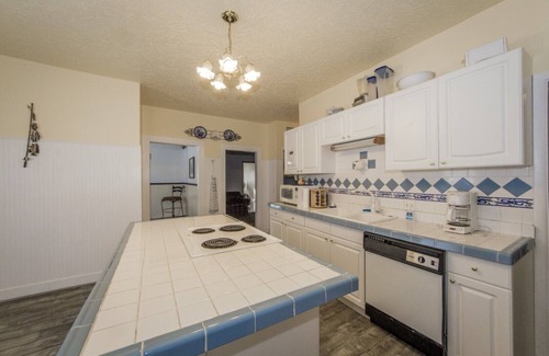 This vacation rental has 5 bedroom 2 bath sleeps 14 comfortably with 4 full sized beds,1 queen, 1 King, and 2 sofa sleepers. This home has a cozy kitchen area with a large attached garage area with picnic tables for large family parties as well as a pool table and TV room to relax in.