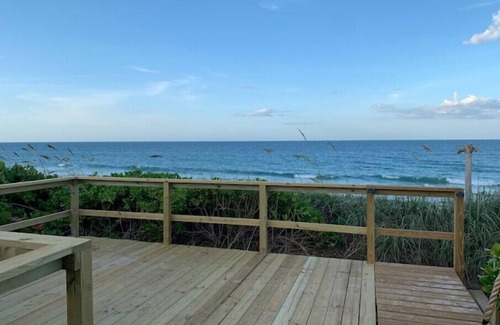 Oceanfront ground level apartment on 1st floor of duplex in a very quiet preservation area 1m north of Sebastian Inlet State Park-Brevard County. This is a one bedroom with queen size bed, full bathroom & walk in closet. Plus a living room w’ sofa bed, breakfast table, fridge/freezer, free standing stove w’ oven, microwave, toaster & washer/dryer. Internet & TV to access streaming accounts. This apartment is ideal for a couple or a small family w’ young child/children. Not suitable for 4 adults.
