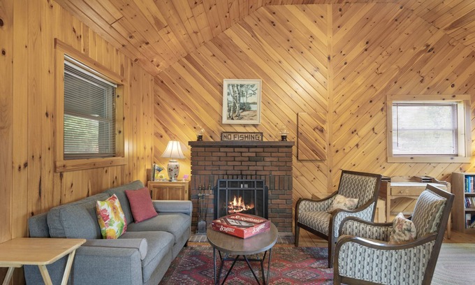 A perfect little retreat for a couple or small family. This one bedroom/one bath house completes the Adirondack feel with pine interior and brick fireplace. An open concept living space makes the space feel bigger with a breakfast bar and access to the screened in porch from the dining area. The twin size day bed is tucked into the living room alcove and is perfect for small families or just lounging. The bathroom has a stall shower and an antique claw foot tub.