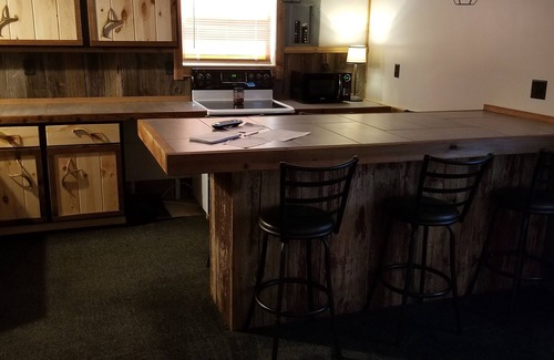 Barnwood cabin is a studio style theme with 2 queen size beds, pool table, and shuffleboard game. Large bar area with seating for up to 6, great for games etc.