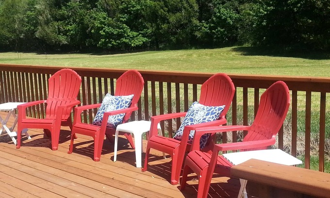 Master bedroom has Cal King bed with private bath, including shower, tub and double sinks. Second bedroom has Queen bed, and there is a double futon is in the extra room/office. Wi-fi, satellite TV, fully equipped gourmet kitchen (owner loves to cook!). One covered deck at front of house and huge back deck with river/mountain views. Five-acre property is ideal for a family reunion with RV's and tents pitched in the back pasture by the river. Owner actually LIVES here part-time, so it's truly a home, not 'just' a rental.