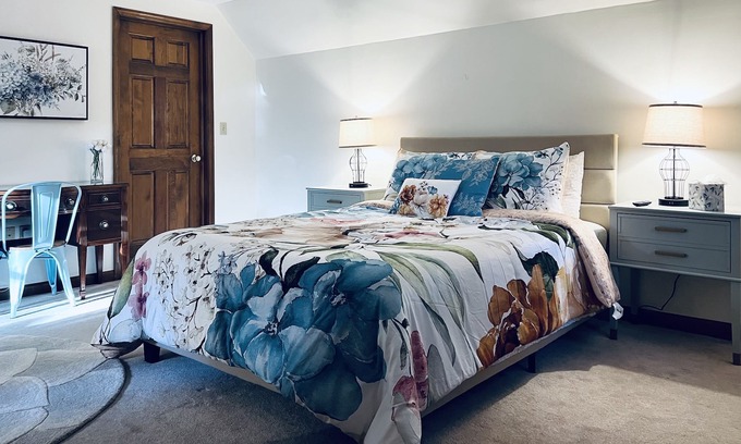 This 2100-sq. ft. home has comfortable sleeping arrangements for up to 10 guests with two queen-sized beds, one double bed and three twin beds plus a double air mattress. The home comes equipped with five televisions (one set up for easy access to router for your own gaming console) and one tv hooked up to a Roku. Sign into your own apps or view using the following streaming apps included with home: Hulu, Disney+, Netflix and Prime Video. Kitchen comes equipped with cooking essentials and extras including microwave, blender, ice cream maker (salt included but must bring other ingredients), popcorn maker, stand mixer, food processor, and slow cooker.