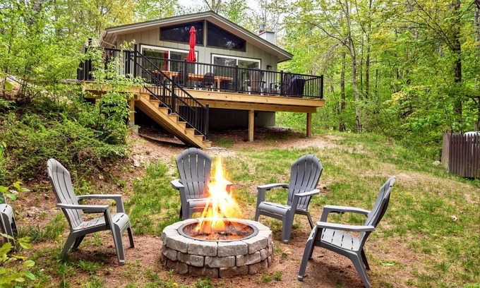 Hidden Creek Cottage is a bright oasis within the New Hampshire lakes region. The floor-to-ceiling windows in the living area fill the space with natural light. The kitchen has been newly renovated with white quartz countertops, white cabinets, and stainless steel appliances perfect for your culinary needs. The primary bedroom boasts a king bed with a memory foam mattress and an ensuite half bath. All bedrooms are equipped with room-darkening curtains to ensure your sleep is as peaceful as your surroundings. Curl up next to the fireplace in the living room with your loved ones, dine al fresco on the newly built deck, gather around the fire pit for endless conversation, and enjoy the peaceful view of the creek within the woods surrounding the home. The washer and dryer are located in the full bathroom and available for your use throughout your stay.