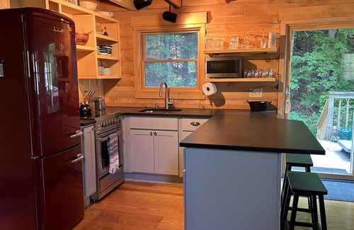 The kitchen has an open concept to the dining area and living room so you can cook and socialize at the same time. The dining table and living room seat 6-8 people comfortably. The wood fireplace in the living room can be used by guests for that authentic log cabin feel. The smart TV offers access to many apps and streaming services.