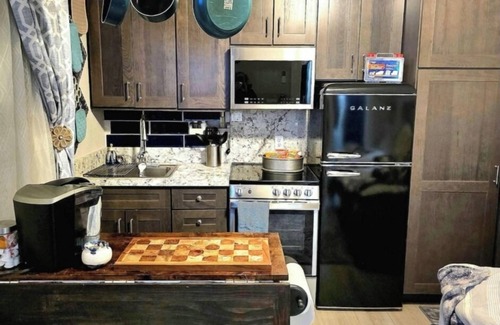 The bright and airy Living Area offers comfortable seating and two large windows that let in lots of natural sunlight. Black out curtains cover the windows if you'd rather keep the sun out & a mini-split air conditiining & heating unit allows you to maintain full control of the temperature. In between the living area & kitchen area sits a kitchen island with a large fold down table top, making this a versitile space ideal for living or as a workspace.