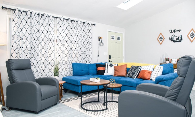 Enter into a beautiful modern living area with bright, natural light from the skylights and large window overlooking the front patio. Spend time enjoying nature in our large, private backyard.